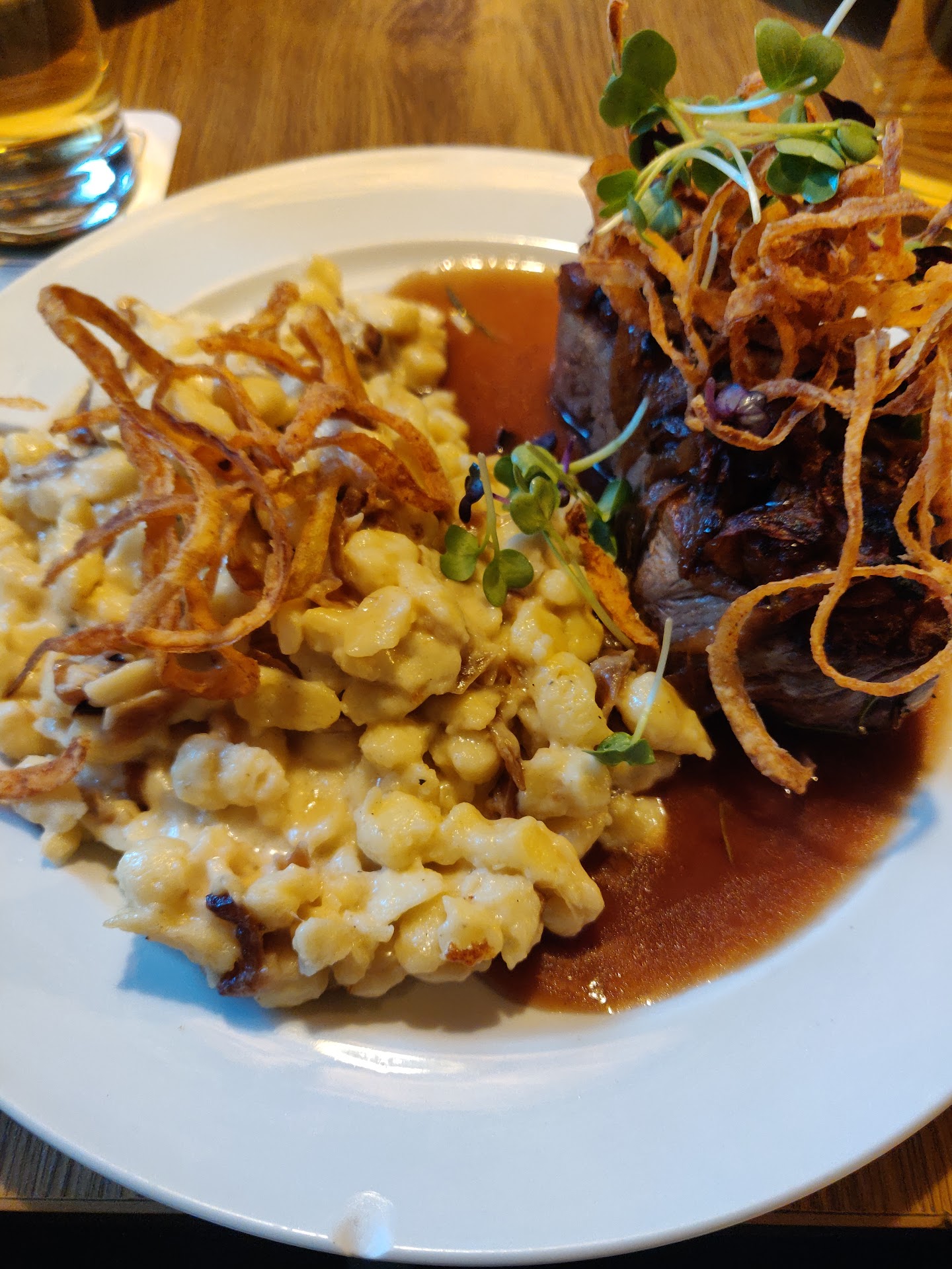 Die Fischgerichte waren herrlich. Auf den Punkt genau, zart und mit den Beilagen ein Genuss. Der Hirschgulasch mit hausgemachten Spätzle war weich und geschmacklich ebenfalls eine richtige Entscheidung. Die Lendchen mit den Käsespätzle und der Champignonrahmsoße war ein Traum. Für mich das beste Gericht an diesem Tag.