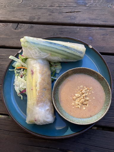 So I went back here and found out it's vegan Vietnamese and I ordered spring rolls, dumplings, a Mango Lassi and the good life bowl. I couldn't decide. So I had to have a lot. 😊