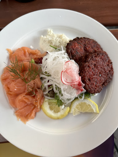 Lastly, we tried the RÄUCHERLACHS on knusprigem Rote Bete Puffer mit frischem Meerrettich (smoked salmon on crispy beetroot pancake with fresh horseradish). The smoked salmon was delicate and rich, served alongside crispy beetroot pancakes that added a wonderful texture. The fresh horseradish provided a zesty kick. The dish was garnished with sliced lemon wedges (which from my perspective could be sliced a bit nicer). This dish was a visual and culinary treat, offering a unique blend of flavors and textures. However, for €17.90 I expected a bit more of salmon.