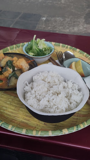 Read moreWhat an absolute gem to find! The little plastic tables and seats looked inviting, the food one one of them looked delicious. I ordered braised aubergine with tofu, one of the vegan options (which they have multiple of!), it was heavenly and a perfect portion size to feel full, but not weighed down so you can instantly continue on with your day/adventure. Everyone was friendly and welcoming. With my food i got a little salad and some apple slices, which goes to show how much love and thought is going into your 7€ meal. Will definitely...