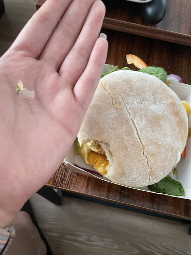Der Burger war samt Verpackung verkehrtherum, scheinbar in die Papiertüte "geworfen" worden. Die Soße quoll an den Ecken heraus, die Box war eingeweicht. In der Box drin war der Burger nicht als solcher zu erkennen, sondern alle Bestandteile waren maximal zueinander verschoben. Es war mehr eine "Burger-Suppe".