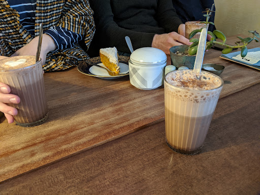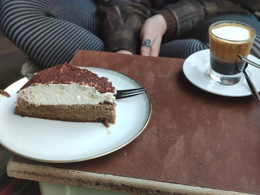 Gemütlich, goldgelb und geschmackvoll. Ästhetische, bequeme Holzsessel in perfekter Kombination mit Parkett und schlichten Lampen. Die Inneneinrichtung des Cafes, besonders die Idee der Tiefen Fensterbretter mit kleinen Tischchen ist raffiniert und stilvoll. Ebenso spannend ist das Kaffeeangebot. Über die Standard-Sorten hinaus gibt es köstlichen Lupinenkaffe, sehr leckeren Leche Leche (Kondensmilch, Espresso, Milch), Cortado, sowie einige weitere Besonderheiten. Die Creme unseres Tiramisukuchens war vorzüglich.(der stark durchtränkte Boden war nicht so meins, gehört aber nun mal zum Tiramisu dazu :D) Einzig der Preis war für ungelogen kleine Stücken mit 4,60€ zu hoch. Das restliche Sortiment (z.b. Chailatte 4,90€, Matcha Latte 3,90€) lag ebenfalls über dem Durchschnitt derzeitiger Leipziger Café Preise. Unabhängig vom Geld, allerdings ein wirklich zu...