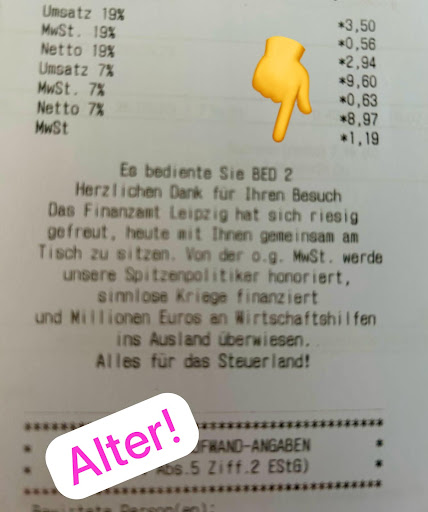 Richtig schlecht wurde es mir aber erst, als ich auch noch die kruden politischen Kommentare auf der Quittung lesen muss. Wie dreist und beschämend ist das?! „Herzlichen Dank für Ihren Besuch. Das Finanzamt Leipzig hat sich riesig gefreut, heute mit Ihnen gemeinsam am Tisch zu sitzen. Von der o. g. MwSt. werde (sic!) unsere Spitzenpolitiker honoriert, sinnlose Kriege finanziert und Millionen Euros an Wirtschaftshilfe ins Ausland überwiesen. Alles für das Steuerland!“