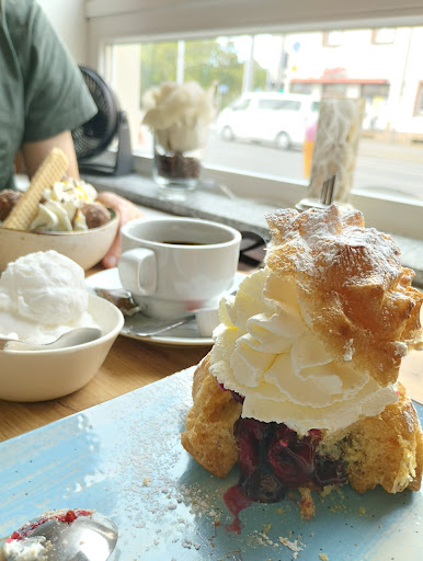 Wir fühlen uns sehr wohl hier! Lecker hausgemachter Kuchen🍰🍩, die Kaffees☕️🫖 sind sehr gut und es gibt ein schönes Angebot an Eisbechern🍧🍨. Diverse alkoholfreie 🫗und alkoholische Drinks 🍹🍷🥂🍻sind auch im Angebot. Das Café ist sehr freundlich eingerichtet und es lässt sich schön innen sitzen. Ein Besuch lohnt sich immer wieder gerne....