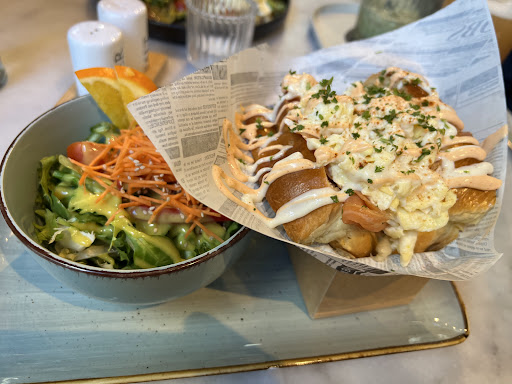Read moreI am a Vegeterian and ordered Egg-Drop avocado Sandwich with sweetpotato fries. The waitress somehow registered a egg drop salmon sandwich!(again I am a vegeterian). After the food came, I brought the salmon issue to her attention to which I got asked a strange question. „ Can we take out the salmon and give it to you again“? Naturally, I asked for a new sandwich (like I ordered 40 minutes ago). After a wait of 10 minutes she bought the Sandwich (colder this time) but with the same set of fries served to me before, the fries were really cold by now. Exhausted by the cold food and an even colder treatment, I decided to eat my sandwich (which I think was not cooked fresh and the salmon was just removed from it)