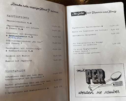 Ich war am Samstag zum ersten Mal dort. Von dem ersten Eindruck war ich zunächst geschockt. Die Bedienung war sehr freundlich, die Inneneinrichtung ist sehr speziellel. Und auch wenn man es nicht glaubt der Laden ist sehr sauber. Da ich auch Hunger hatte, habe ich mir etwas zu essen bestellt. Erwartet habe ich ganz normale Kneipenküche. Aber was da an den Tisch kam hat mich echt überrascht. Ein liebevoll angerichtes Schweinegeschnetzeltes und Pommes mit Salatbeilage. Sehr gut abgeschmeckt sehr lecker, einfach nur zu empfehlen.