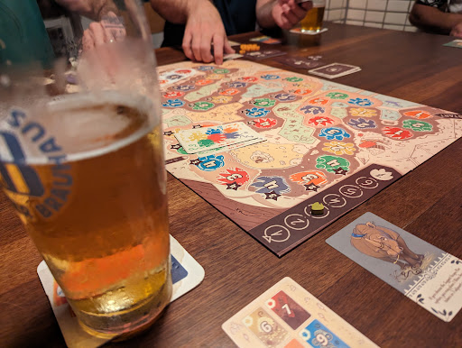 Craft beers spotlighted in cozy quarters with a relaxed, rustic feel & selection of board games.