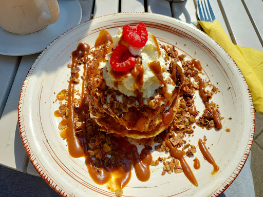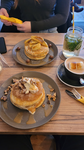It's a nice cafe, located right at a tram stop, making it very easy to reach. To have a good experience, I would highly recommend reserving a table a day before, since this cafe will most definitely be full, especially on the weekend. The cafe itself is very small, with not a lot of space available for seating, making it difficult to have conversations or be in a big group. The food is great, I've only had the pancakes, and they were near perfect. I also had the hot chocolate, which is made with actual Cocoa, making it very bitter, which might not be for everyone. You'll find a lot of variety on the menu, ranging from pancakes to porridge and granola bowls. The service was friendly and quick, but due to it being so crowded, you might have to ask or go up to the registration for extra wishes. It's also important to note that this is a very expensive cafe, with pancakes ranging from 9 to 16 Euros and the porrdiges and granola being similar prices, making it easy to spend up to 25 Euros per person.