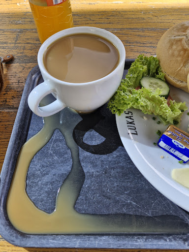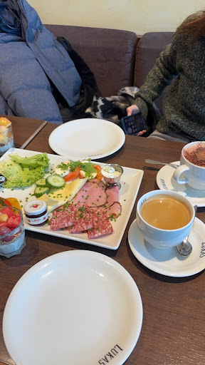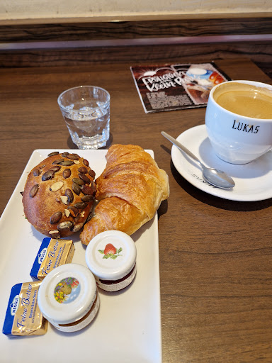 A perfectly good bakery with a nice breakfast selection. While the LUKAS brand has to offer a variety of traditional baked goods, among those breadrolls, bread, sandwiches and the occasional sweet treat, this place is also good for a quick - or more elaborate - breakfast. The seating area is comfortable with a lot of light from the large glass front. There are breakfast combinations available which may include jam, sausage, cheese, eggs, bread rolls, fruit, etc. Something for everyone, but rather expensive. For an affordable quick morning, I recommend ordering a hot beverage and a sweet or savoury piece of baked good, a French chocolate bun for instance, instead of a complete breakfast. Everything on display can be ordered "to stay" on a plate, and there is really a lot to choose from. The coffee is perfectly fine, and they also have vegan milk alternatives. To my mind, LUKAS is more of an everyday kind of place, which does not excell at anything, but it serves its purpose. I would recommend it to students, passers by and generally people in a hurry who have skipped...