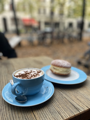 Ambiente: Sehr gemütlich. Vor allem die großzügig blau gestrichene Wand mit den passenden Kaffee und Brot Bildern wirken sehr entspannend (da stört es auch nicht, dass die Wand an.manchen Sitzecken etwas ramponiert ist ). auch mag die Holzoptik dazu, man sieh nur leider dass es eine Vertäfelung oder aufgeklebt sein muss oder dergleichen,denn man erkennt ein wiederkehrendes Muster sehr schnell. Unwahrscheinlich, dass es echtes Holz ist. Da hätte ich mir doch lieber gewünscht dass man etwas mehr Geld in.die Hand nimmt und echtes Holz als Blende nimmt für.di Theke. Vielleicht liegt es an corona aber dass die Tische so weit auseinander stehen macht es für mich auch entspannter. das lässt alles viel offener,freundlicher und frischer wirken. sollte so beibehalten werden.