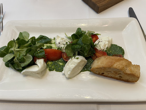 ESSEN und TRINKEN Als kleiner Gruß aus der Küche wurden wir mit frisch gebackenen Brot und Butter begrüßt. Das Brot war noch leicht warm und hat sehr gut geschmeckt. Als Vorspeise habe ich Büffel-Mozzarella mit Pesto und Tomaten bestellt. Das war eine sehr gute Wahl und speziell das Pesto war sehr intensiv und hat perfekt zum Mozzarella gepasst. Bei der Hauptspeise ist die Wahl auf das gebratene Schwein, mit Gemüse und Spätzle gefallen. Das Schwein war lecker, saftig und gut gebraten und die dazugehörige Jus war perfekt, nur hätte es ein wenig mehr Soße sein können. Die Spätzle waren leider in Summe ein zu trocken und es hat dazu dann einfach die Soße gefehlt. Zur Nachspeise gab es einen Blondie, mit einer dunklen Schokoladensosse, welche richtig wuchtig und dick war. Das war einfach ein perfektes Stück Himmel auf meiner Zunge. Ich hatte echt Glück, da ich ein Stück aus der Mitte erhalten habe. Meine Gäste hatten leider ein Stück vom Rand, welches dann wiederum zu trocken war. Das darf in dieser Restaurantklasse einfach nicht passieren. Hier muss man den Rand abschneiden! Aber mein Teller war der perfekte Abschluss. Zum Abschluss gab es nach dem Dessert noch einen Espresso. Dieser kostet 4,00 € und wird mit einem kleinen Keks serviert. Der Espresso an sich ist lecker, vollmundig, lecker und intensiv. Zudem ist hierbei das Mengenverhältnis gut eingehalten und der Espresso ist nicht verwässert. Leider ist aber der Preis einfach nicht adäquat. 4,00 € sind einfach zu viel des guten, da ist einfach zu viel Marge eingeplant.
