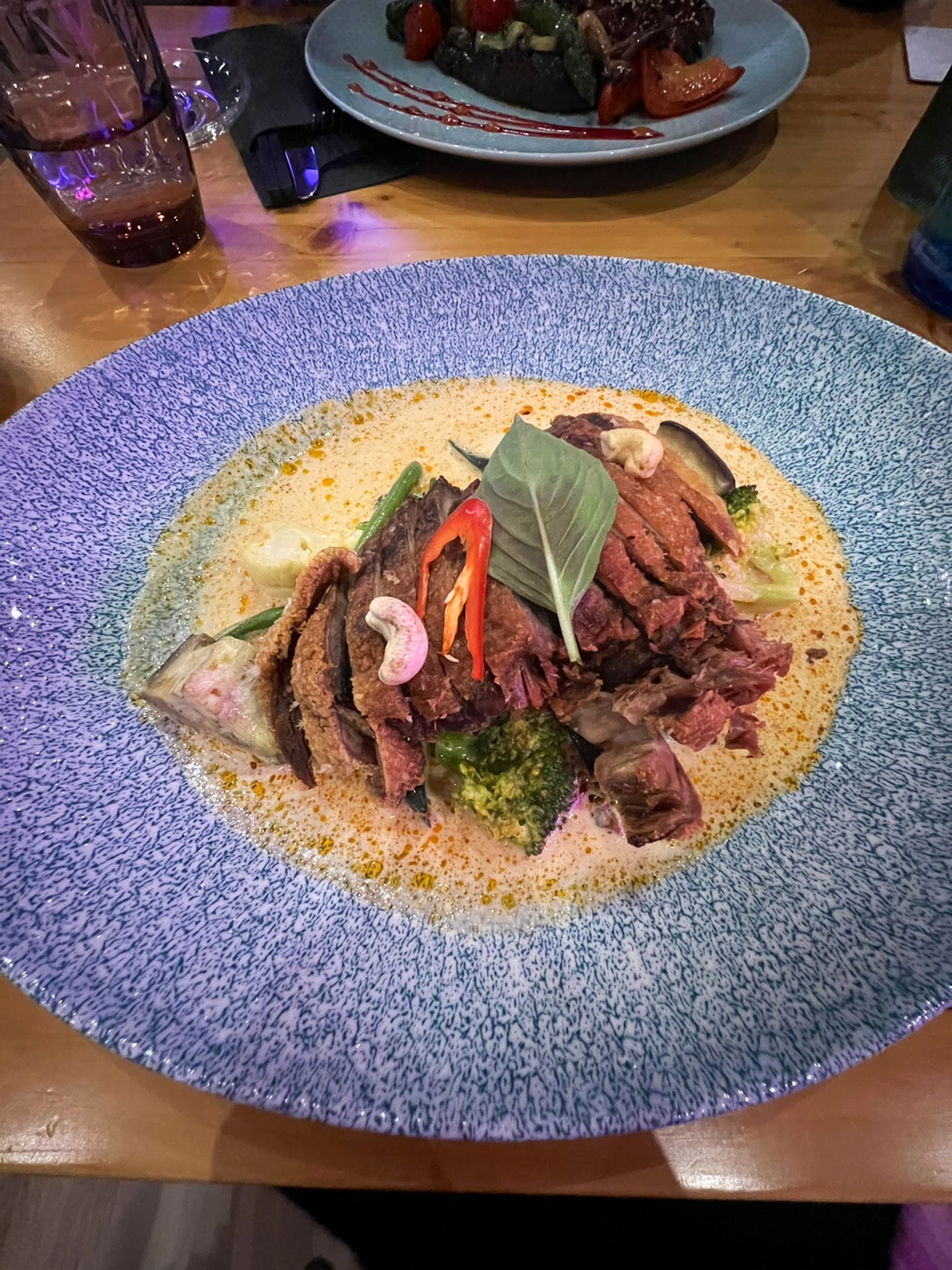My main: duck with curry sauce. The vegetables were well-prepared, the sauce pleasant, but the duck itself leaned toward dry. A shame, because it had potential. My partnerâs mango salad, sadly, was underwhelming â and not just in quantity. A handful of tiny mango slices were floating in a dressing that reappeared later as part of our dessert. Repetition is only charming when itâs intentional.