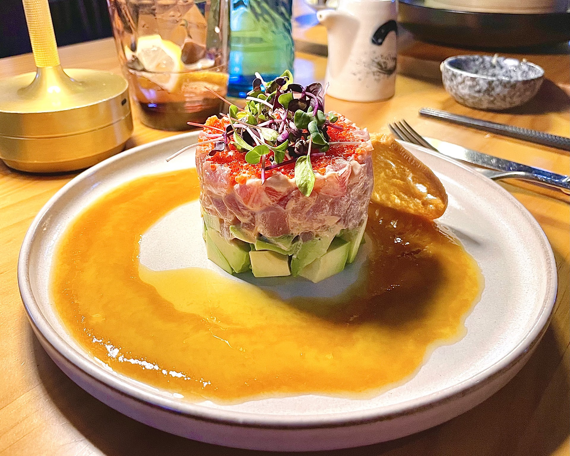 The starters were a mixed bag. The aubergine? Delightfully silky, though it was begging for just a touch more salt. The vegetarian dumplings â steamed â were fine, but didnât quite punch above average. My tuna tartare, on the other hand, missed the mark: over-marinated, drowning a bit under its own ambition, and with too much caviar on top. Also, the avocado wasnât ripe â that green, slightly bitter tone dominated more than it should have.