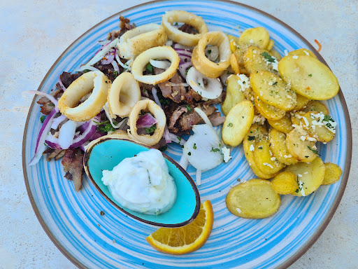 Als Hauptgang hatten wir beide "Gyros Calamaris". Es kam ein ĂŒppiger Teller bestehend aus Gyros vom DrehspieĂ, frittierte Tintenfischringe, kretanische Kartoffeln, Tzatziki und ein separater kleiner Salat. Das Gyrosfleisch schmeckte frisch, war fĂŒr meinen Geschmack aber etwas zu fettig. Der Tintenfisch war sehr lecker und wurde ebenfalls frisch zubereitet. Die kretanischen Kartoffeln erinnert etwas an Bratkartoffeln und hatten einen starken genau richtigen Knoblauch-Geschmack.