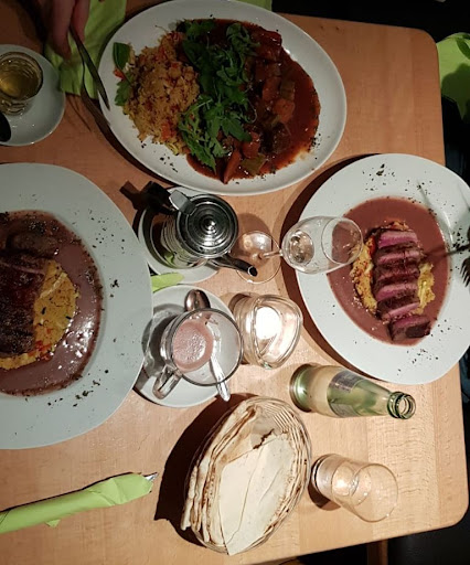 Ich bin aufgrund meiner vielen Reisen nach Marokko (Marrakesch, Fès, Rabat, Meknès, El Jadida …) seit 2009 und nach Israel und Palästina sei 1999 gewöhnt, bestes orientalisches Essen zu genießen. Inzwischen kann ich ordentlich meine Lieblings-Tajine „Lamm mit Pflaumen und Mandeln“ und Gemüse-Tajine zubereiten; will sagen, ich glaube gut beurteilen zu können, ob die Küche echt ist (und das macht nicht nur die Kochkunst des Einzelnen, sondern auch die verwendeten Gewürze) oder eingedeutscht oder europäisiert ist. Bei Shady stimmt alles: das spontane und direkte Service sowie die Speisen. Die Vorschläge von Shady Elwan (Inhaber, Chefkoch und Service in einer Person vereint) und die Umsetzung durch Jean-Paul Riemer sind nicht nur gelungen, sondern perfekt. Nicht zu übertreffen am delikaten Geschmack und an Finesse sind die Lammkroketten مختنقو لحم الضأن (Vorspeise) 4 Stück vom 6 Wochen abgehangenen Lammkeule mit Datteln, Feigen und Gemüse in Sesamkruste, dazu Süßscharfe Sauce, das ist ein himmlischer Genuss so wie die Feigen belegt mit gegrilltem Ziegenkäse. Und dieses Fest fand seine Fortsetzung bei den Hauptspeisen. Zunächst das Lammfilet, mari-niert/gegrillt/geschnitzelt/fr. Gemüse und Reis übergossen mit Mangosauce bzw. das Lahm Kharuf Matbuch Lammragout لحم خروف مطبوخ marokkanischer Art geschmortes Lammfleisch فيليه لحم الضأن in würzigem Tomatensud, mit Gemüse, Datteln und Feigen, dazu warmen Couscous. Die Zubereitung ist so fein, dass man sich danach angenehm fühlt, auch deshalb, weil die Portionen gut dosiert sind. Das Preisleistungsverhältnis ist mehr als in Ordnung. Das Restaurant angenehm schlicht ohne Klischee und Kitsch. Jorge Luis Borges würde sich darüber sehr freuen und deshalb dort auch gern verkehren: