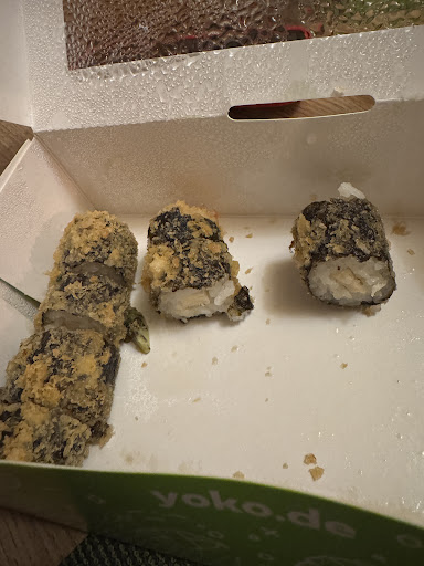 Angeblich sollte das Essen nach 30 min kommen. Es kam dann - ohne Mitteilung bzgl. der Verspätung oder einer Entschuldigung seitens des Fahrers - nach knapp einer Stunde. Wäre das Essen wenigstens lecker, wäre dies zu verkraften gewesen. Ich hab’s dann meinem Hund gegeben. Das Sushi war wirklich ekelhaft und sah auch sehr unappetitlich aus (Yoko Single Menü Veggie). Übrigens wurde die Mayosoße vergessen, scheint laut der Rezensionen aber öfter vorzukommen. Und ans Telefon geht auch niemand, als ich anrief. Wobei offiziell geschlossen war, das hatte mich nach meiner angenommenen und bestätigten Bestellung verunsichert.