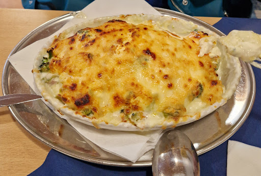 Die Pizza schmeckt gut und hat eine ordentliche Belagdicke. Man wird auf jeden Fall satt! Es steht eine große Anzahl an Zutaten zur Auswahl, mit denen man sich eine eigene Pizza kreieren kann.