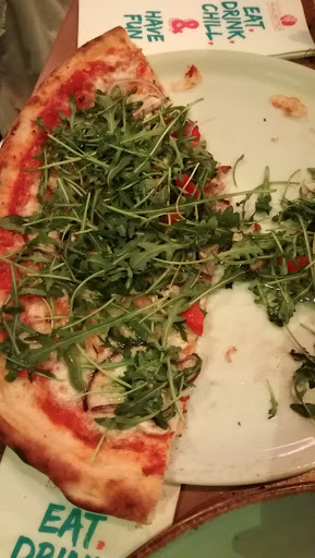 Read moreCooles Lokal, nette Bedienung. Wir hätten uns mehr Auswahl an Essen gewünscht. Es gibt kaum bzw. keine Vorspeisen. Pizza war riesig (ist super), etwas größer als der Teller (nicht gut) dafür, weil das das Schneiden der Pizza an einem kleinen Tisch für zwei Personen sehr erschwert. Leider war unsere Pizza vorher nicht geschnitten. Es wurden keine zusätzlichen Teller serviert, bei Nachfrage habe ich zusätzlichen noch einen großen Teller, wie bei der Pizza selbst, erhalten...die Bedienung hat hier nicht mitgedacht und musste nochmals einen kleineren Teller holen (*leider hat es sich etwas gezogen), da der andere Teller keinen Platz auf dem Tisch hatte (diese Aktion an sich hat uns noch nicht gestört). Als die Bedienung etwas Platz auf unserem Tisch verschaffen wollte, wurden unsere Servietten mitgeschleppt. Danach mussten wir wieder dafür sorgen, dass Servietten auf den Tisch kommen (dafür gibt es aber auch noch keinen Sternabzug). Pizza Vegie hat sehr gut geschmeckt, es lag aber zu viel Grünzeug darauf. Was uns aber an dem Abend gestört hat, dass es sehr warm im Lokal war. Ich persönlich konnte mich bei den Temperaturen nicht wohl fühlen, die Nachbarn neben uns, die länger da waren, haben auch schon geschwitzt...