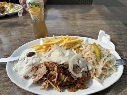 Also. Das wird hier kein Gefällligkeitsgutachten. Parken ist schon was miserabel aber deswegen geht man ja nicht hin. Und dafür kann der Laden nichts. Leute sind nett und bemüht und geben alles. Die können ja nichts dafür das die Pommes im Schnitt 2- 3 cm, maaaaaximal 4 cm haben und extraaaa dünn sind. Da ist wohl die dauerhafte schlechte Kartoffelernte schuld. Auch wenn es hier Fotos mit normalen Pommesgrößen gibt, gebe ich hier keine Garantie das man die auch bekommt. Dafür das die Pommes so klein sind kommt deren Würzung ganz groß raus. Hier wird die Gewürzindustrie kräftig gepuscht. Wie kann man Pommes sonst würzen? Mir fällt einfach mal nur Salz ein. Aber das wäre zu einfach. Also rauf damit, was geht. Pommes- Würzmischungen können ja nur gut sein. Wahrscheinlich bekommt anschließend jeder mal etwas Sodbrennen und einen Glutamatschock, aber das geht ja wieder weg. So sehenswert und schmackhaft die Pommes auch sind, so schmackhaft ist der Krautsalat. Feine Noten von Olivivenöl werden von Essig und noch mehr Essig übertünscht. Kann ja jedem mal passieren das die Flasche reinfällt. Da bekommt Sodbrennen eine zusätzliche Note. Aber moment, war das tatsächlich Olivenöl? Ich kanns nicht mit 100%tiger Sicherheit sagen. Hatte ja schon Sodbrennen wegen der Reizüberflutung der Pommes. Ausserdem beim Griechen gibt's Olivenöl! Basta! Abgerundet war der Teller mit Tzatziki. Schön fest wie er sein soll.... oder doch nicht so fest? Jedenfalls steht die Gabel fest verankert im Block und sucht die Gurke . Die Gurke im Tzatziki, die war noch auf dem Feld. Hatte es nicht rechtzeitig auf den Teller geschafft. Dafür "spendiert" man eine Olive. Ist ja auch eine "Feld-Frucht". Man muss auch gönnen können. Olive und Peperoni kosten ja nur 1€ mehr. Die waren bestimmt handverlesen. Nennt sich dann Gyros komplett und lässt die Kasse klingeln.