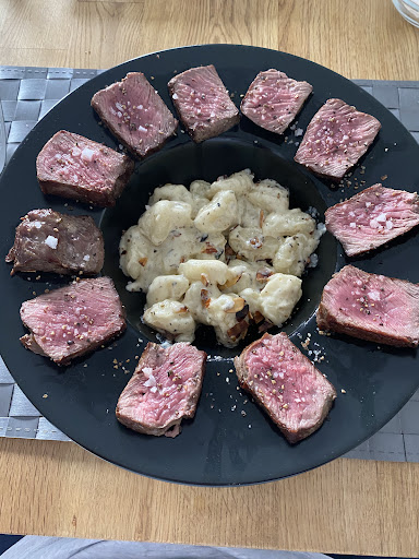 Die Pasta meiner Freundin schmeckte nach zuviel Beigabe der Gewürzmischung von der Marke Kania (geraten) , sehr würzig, keine gute Komposition. Sie bekam es schwerlich runter. Seltsam dachten wir..