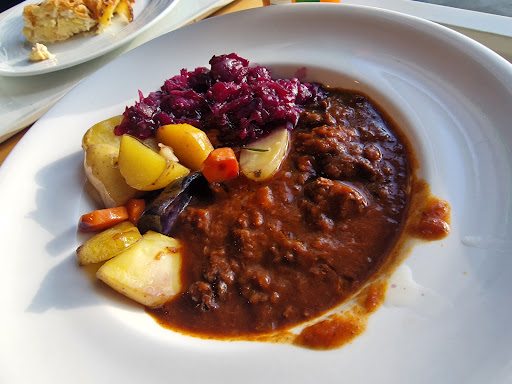 Manchmal stimmt das Preis-Leistungsverhältnis überhaupt nicht. Foto: 2 wirklich kleine Scheiben Spießbraten und eine Apfelschorle für 8,60 Euro. Ich bitte zu beachten das es sich hierbei um den kleinen Teller handelt. Normalerweise ist von der Menge eine Scheibe alleine schon soviel. Musste Plastikbesteck nehmen da man das auch vergessen hat.