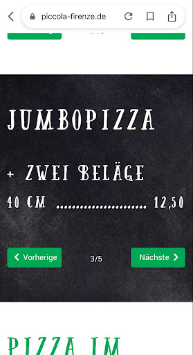Read moreKATASTROPHE!!!! 2 Jumbo Pizzen mit jeweils 2 BelĂ€gen bestellt. Laut Karte = je Pizza 12,50âŹ. Komme hin und die eine sollte 15âŹ, die andere 18⏠kosten!!! ABZOCKE!!!!! Musste mir dann erzĂ€hlen lassen, dass die BelĂ€ge mit KĂ€se teurer sein mĂŒssen. Es sei auch nicht möglich das auf die Karte zu schreiben und am Telefon mir bei der Bestellung direkt sagen wieviel es kosten soll geht angeblich auch nicht. Aber wenn ich dann da stehe soll ich es gefĂ€lligst bezahlen weil ich ja einen Vertrag eingegangen sei. Also eine absolute Frechheit was dort gelaufen ist. Super aggressiv mit Androhung die Polizei zu rufen. WĂ€re am Ende wohl das beste gewesen sie hĂ€tten es durchgezogen und die Polizei gerufen. HĂ€tte gerne direkt eine Anzeige aufgegeben. Die Preise nach Lust und Laune zu wĂŒrfeln, nicht vorher zu sagen und dann erst bei Abholung zu sagen was es kosten soll kann ja nicht sein oder???!!! Kein Wunder das hier nur Barzahlung möglich ist. Abstand halten bei aktuellen Coronaverordnungen und Maske tragen war leider bei dem Personal nicht möglich. Und das bei einer sehr hitzigen Diskussion. Naja, am Ende habe ich Hausverbot bekommen und die sonst sehr lecker Pizza dort gelassen. Sehr gerne rate ich jedem davon ab zur Pizzeria Piccola Firenze zu gehen. Sorry aber das...