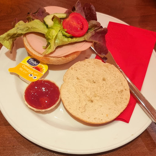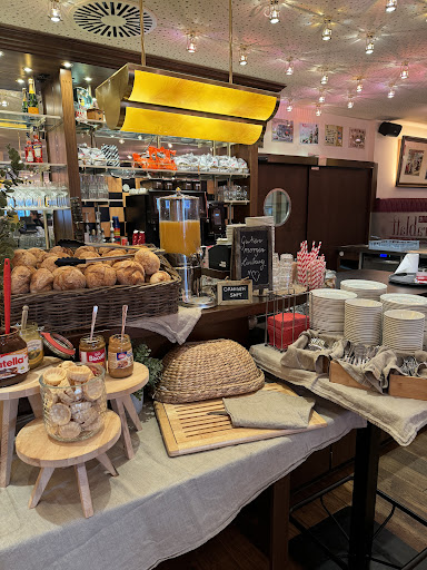 Read moreDas Frühstück ist von der Qualität der Speisen im normal guten Bereich, wenngleich ich mir etwas mehr Auswahl wünschen würde. Hochwertige Lebensmittel fehlen. Das ist sicher bei 16€ auch nicht möglich. Wer oft in guten Hotels frühstückt, dem ist das hier vielleicht etwas dürftig. Die Teller sind relativ klein, sodass sie sich lediglich gut dafür eignen, die verschiedenen Speisen getrennt auf den Tisch zu stellen. Zum Essen bin ich auch größere Teller gewohnt.grössere Teller fehlten jedoch komplett. Damit sich nicht alles türmt, benötigt man im Normalfall 3 Tellerchen für div. Sorten, evtl. noch eine Schale für Müsli und Obst, Bestecke und einen Teller zum drauf zubereiten und essen. Da läuft man also einige Male bis man alles auf den Tisch hat, wenn man kein Oberkellner ist. Es gab auch viele Gäste, die vom aufgetürmten Teller gegessen haben. Wurst, Ei, Brötchen, süßes alles auf nem Mini-Teller. Dieses Bauarbeiter-Frühstücken ist nicht so meins. Die Atmosphäre wird nicht durch die Einrichtung bzw. das Ambiente gestört, die ist schön, sondern viel mehr durch die viel zu laute Musik, gegen die dann unglücklicherweise noch 200 Gäste anreden. Eine unglaubliche Unruhe in dem Laden. Das Personal ist allerdings sehr freundlich, aber wie könnte es anders sein, in einem so vollen Laden auch etwas überfordert. Viel Gedränge am Büfett kommt noch dazu. Zum sonntäglichen Verwöhn- und Entspannungsfrühstück nach einer anstrengenden Woche, eignet sich das...