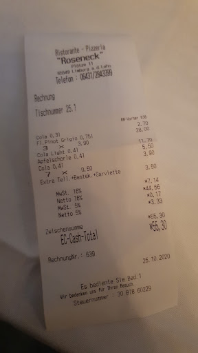 Read moreIch habe mit Verwandten einen Ausflug nach Limburg gemacht um das schöne Städtchen mal zu besichtigen. Gegen Mittag machte sich ein Hungergefühl in uns breit und wir machten uns auf die Suche nach einer geeigneten Lokalität. Wir entschlossen uns dann nach ein bisschen Umhersuchen und Preise vergleichen ins Restaurant Roseneck zu gehen. Wir saßen draußen und wurden auch gleich zügig bedient. Während sich alle anderen für eine Pizza entschieden, nahm ich eine Pasta mit Rigatoni-Nudeln und einer Tomaten-Sahne-Soße, welche mit Pilzen versehen war. Als mein Teller ankam, musste ich leider feststellen, dass es Penne waren und keine Rigatoni. Ich habe jedoch keinen Anstand gemacht und habe gegessen. Es hat den anderen und mir sehr lecker geschmeckt und der Preis war auch angemessen. Die Bedienung war sehr freundlich. So konnten wir gut gesättigt unseren Rundgang in Limburg...