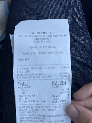 If you're ever in Lindau, never go to the restaurant under Hotel Helvetia, La Mômmerie. My mother and I were there for 40 minutes and only got drinks which we got 5 minutes after we got there. We were then ignored by everyone for the remaining 35 minutes. We almost left without paying. When we eventually did decide to pay the waitor was pretty rude and it seemed like he thought we were worth less as human beings.