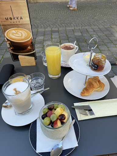 Ehrliche Rezension: Das Café war sehr überfüllt, dennoch haben wir einen Platz bekommen, weil gerade ein Pärchen aufgestanden war. An sich ist das Ambiente schön, im Kern der Insel, rundrum viel Altbau und Blumen aufgestellt. Die lockt im Sommer allerdings auch Wespen, Bienen und Fliegen an. Zusatzlich das süßliche Essen und die Insekten fühlen sich sehr wohl. Deshalb haben die Betreiber auch „Fallen“ aufgehangen. Diese nützen leider nur kaum etwas und uns war es nahezu unmöglich in Ruhe zu Essen - Achtung für Allergiker sehr ungeeignet! Das Essen an sich kam nach 45min (manche hatten es bereits nach 15min) und war in Ordnung. Mein Partner hatte ein Rührei welches auf Brot ankam, dies war mit dem Messer jedoch unmöglich zu schneiden. Ich hatte ein Omelette mit Avocado, Tomate und Mozzarella - an sich in Ordnung allerdings verstehe ich nicht warum man den Mozzarella nicht mit dem Omelette verrührt hat, denn nur als Füllung hat er den ganzen Teller vollgesuppt. Auch die Avocado war teils bereits braun, was das Ganze unappetitlicher machte. Das Mokka Frühstück hingegen war von der Preis-Leistung top. Wir haben nur nicht verstanden warum der Lachs quasi ein Filet und weniger ein Brotbelag war sowie alles mit Paprikapulver bestreut wurde. Da man keine Zange dazu bekam, war es nur mit den Fingern möglich, die Beläge herunterzunehmen - man hatte also überall Paprikapulver. Ich hatte aufgrund der mangelnden Qualität erstmal per Karte kein Trinkgeld gegeben - das wollte ich Bar machen, da meist der Kellner selbst nichts davon sieht wenn man per Karte zahlt. Dieser wurde dann aber so aufdringlich, als ich per Karte kein Trinkgeld geben wollte, sodass ich mich auch Bar dagegen entschied. Alles in allem war es ein Besuch, den ich nicht wieder...