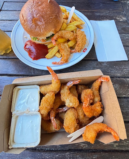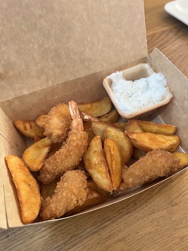 Das Essen war top: • Die Schrimps im Teigmantel waren nicht nur lecker, sondern auch preislich absolut fair. • Der Lachs-Burger war richtig groß und sehr schmackhaft – sättigend und hochwertig, definitiv mehr als man sonst von Fast Food erwartet. • Die Pommes waren zwar etwas kalt, aber angesichts der späten Uhrzeit absolut verständlich – kein großer Minuspunkt.