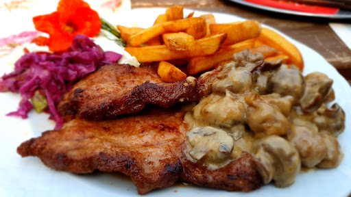 Das Landgasthaus liegt nahe der A38, einer Autobahn mit sehr wenigen Raststätten, weshalb ich auf der Siche nach einem Mäcces dort vorbei kam. Ein Treffpunkt für Reisende, Stämmgäste und Ausflügler. Im lauschigen Geraniengarten auf rustikalen Bänke kann sich niederlassen und wohlfühlen. Ein leichter Wind war heute genau richtig, dazu das entspannende Plätschern des Gartenteichs. Kurz nachdem ich mich hingesetzt hatte, konnte ich schon meine Bestellung aufgeben. Eine Karte gibt es nicht, aber der Weg zum Garten ist mit Schildern gesäumt. Ich habe mich für Nackensteal mit frischen Champignons und rustikalen Pommes entschieden. Das Bild spricht für sich selbst. Die Nackensteals waren saftig und gut gewürzt, die Pommes knusprig und Champignons und der Salat wie sie sein sollten.