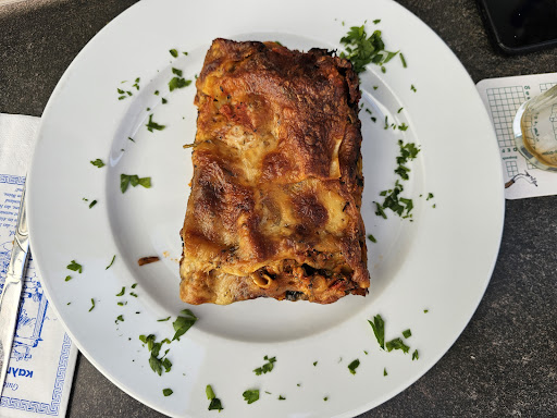 Ich hatte einen Syrtaki-Teller, der war in Ordnung. Meine Tochter hatte vegane gefüllte Paprikaschoten und hatte daran auch nichts auszusetzen. Aber es gibt noch einen weiteren Kritikpunkt. Es dauerte alles ziemlich lange. Die Bedienung war zwar überaus nett und freundlich, da gibt es nichts auszusetzen. Aber sie war wahr vermutlich ganz allein außer dem Koch. Sie war zuständig für das Zuweisen der Plätze neuer Gäste, für die Bedienung, für das Kassieren und vermutlich hat sie auch die Getränke selbst gezapft. Das weiß ich nicht, weil wir draußen gesessen haben und somit von Vorgängen im Haus nichts mitbekamen. Aber fast eine Stunde Wartezeit auf's Essen ist sicher schon recht ordentlich. Dazu dann noch weitere Wartezeiten. So gab es erst das merkwürdige Metaxa-Gyros, aber die Folienkartoffel dazu ließ etwas auf sich warten. Zum Nachordern neuer Getränke musste man Glück haben, die Bedienung zu "erwischen" und an der Folienkartoffel fehlte meiner Frau Salz. Das war natürlich ebenfalls schwierig zu bekommen. Hat zu guter Letzt aber rechtzeitig geklappt.