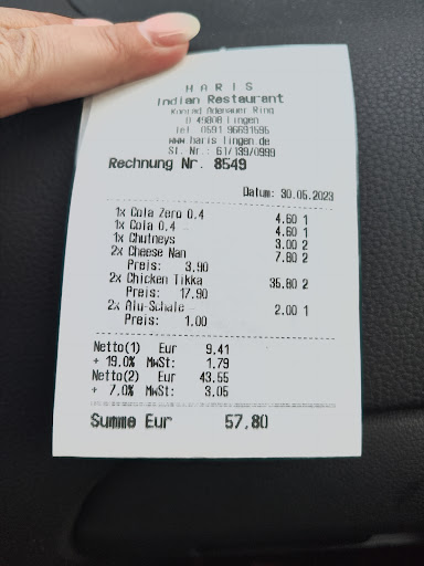 Read moreThe best Indian food out of India, I am from USA and we went there for Business trip for GE salzbergen. We stayed for two weeks and 1st three days we didnt find a good restaurant or food, then we found Haris Indian Restaurant and from that day all 10 days we ordered food from this restaurant. The food was awesome tasty, you should taste Gambassi tandoori which i felt as special and Biriyani is nice too. Dont forget to taste paneer aswell. We are group of South indians and North indians, both loved the food there. Mainly persons who knows tamil will get a good friend over there. Thanks Karan for your good food and now you are my good...