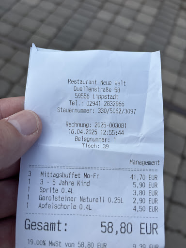Read moreDas Restaurant wurde uns sehr empfohlen, allerdings bin ich persönlich sehr enttäuscht. Aber da es am Samstag rappel voll war und wir nur mit rechtzeitiger Reservierung überhaupt einen Platz bekommen haben, scheint das Angebot bei der Allgemeinheit gut anzukommen. Meine persönliche Erfahrung: sehr großzügiges Angebot an Speisen (am Samstag nur Buffet, keine Menüwahl?), allerdings wurde das Fleisch komplett durchgegart und war daher z. T. wie Schuhsohlen und nicht geniessbar. Da ging einiges von unserem Tisch leider wieder zurück. Das Gemüse war ebenso viel zu lange auf dem Grill - sehr schade, da die Qualität scheinbar sehr gut war. Andere Rezessionen haben auch schon darauf hingewiesen: die Kühlkette wird völlig ausser acht gelassen. Die gekühlten, rohen Speisen (wie z. Bsp. Fisch!) bleiben an einem gut besuchten Abend über längere Zeit (eine Std. ist keine Ausnahme) vor dem Grill auf einem Servierwagen stehen und warten darauf, fertig gegrillt zu werden. Die rohen Speisen stehen dort ungekühlt und völlig ungeschützt. Der beliebte Schokobrunnen ist eine eher eine Quelle der Bakterien und Verunreinigungen! Durch den offenen, großen Raum ist die Geräuschkulisse enorm, eine Unterhaltung am Tisch nicht möglich. Die Servicekraft war sichtlich genervt und angestrengt, aber um freundlichkeit bemüht. Für mich ein absolutes no go: keine Kartenzahlung! Diskussion mit der Bedienung - ob ich den kein Bargeld hätte, Kartenzahlung geht nicht. Nein, ich möchte mit Karte zahlen! Ja, aber wir nehmen lieber Bargeld. Ja - das kann ich verstehen, aber ICH MÖCHTE MIT KARTE ZAHLEN! Hey! Ich diskutiere nicht über das Zahlungsmittel! Damit ist die Neue Welt für mich kompl....