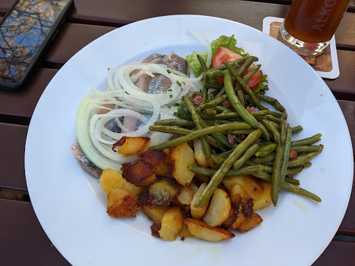 Wir haben zwar kurz auf die Getränke warten müssen, aber vllt. haben wir das auch durch unseren Durst nur länger empfunden. Saisonbedingt gab es einige Pfifferling Gerichte zur Auswahl, außerdem gibt es hier noch eine andere Spezialität: Matjes von der Nordsee (Emden). Diese werden persönlich vor Ort abgeholt. Das machen die Betreiber natürlich nicht aus Spaß, sondern weil sie nur die besten Matjes für unsere Gaumen mitnehmen ;) Ich habe Matjes mit Bratkartoffeln und Speckbohnen gegessen. Dazu gab's ein dunkles Weizen, saulecker.