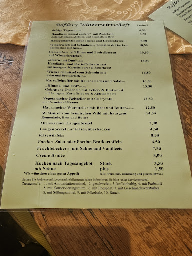 Read more|We arrived in Lorch after 9 p.m. and after urgent showers, were desperate to eat. After a long wander around the dark, quiet town, we finally spotted Rößler at the end of a long street, tucked against the train viaduct, with outdoor seating sweetly done in a modest way.||Frau Röẞler was walking the dog as the restaurant wound down for the night, but saw our pathetic desperation and asked if we wanted some food, and then proceeded to place an order for us in the kitchen based on what she thought they could still do around their cleanup.||We ended up with absolutely delicious, well presented food, served with real heart by her staff despite us being the last in for the night ||Delicious cream of vegetable soup with ham (Speck). Lovely panküchen, one olive, and one ham. One ice cream sundae, and one Erdbeer sundae. ||And four glasses of wonderful wine from their vineyard.||I would return here for the food, or the wine, or the neighborhood ambience alone, and I would absolutely return for the people.||Lovely...