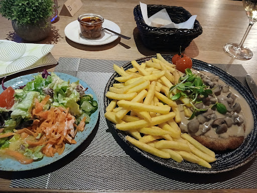Read moreEinrichtung, Ambiente nicht besonders gemütlich. Abtrennungen zw allen Tischen würden schon etwas bewirken. Personal steht lustlos hinter der Theke..vielleicht hatte sie einen schlechten Tag. Servicekräfte sehen für so ein Restaurant, Sonntag Mittag, eher ungepflegt aus. (schwarze Turnschuhe, jeans....) Apperetif und Vorspeise.(Suppen waren sehr gut) wurden sehr zügig serviert, danach kurz vorm verdursten....erst als die Hauptspeise schon serviert war kam man auf die Idee nach Getränkebestellung zu fragen.. Hauptspeise: Salat nicht frisch und knackig, sondern welk, gurken schon eingetrocknet! Der Salat war vom Tag zuvor! Pommes ohne Salz und geschmacklich undefinierbar, das Kalbsschnitzel mit gebratenen Pilzen war jedoch ausgezeichnet Das fehlende Salz auf den Pommes befand sich auf dem Rumpsteak meiner Gattin... Der Koch ist scheinbar verliebt... das Rumpsteak an sich war ebenfalls ausgezeichnet gebraten. Für das super gebratene Fleisch und die guten Suppen gibts 2 Sterne, ansonsten eher nach dem Motto ..naja...