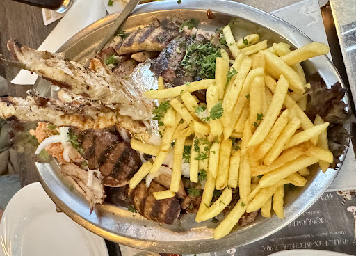 Die Platte war ansprechend angerichtet, geschmacklich aber sehr durchwachsen: • Das Gyros war gut, aber die Menge für zwei Personen zu knapp. • Die Bifteki winzig und leider durchgegrillt – geschmacklich enttäuschend. • Die Leber war okay, aber ebenfalls klein portioniert. • Das Souvlaki war sehr zäh, man musste ordentlich kauen.