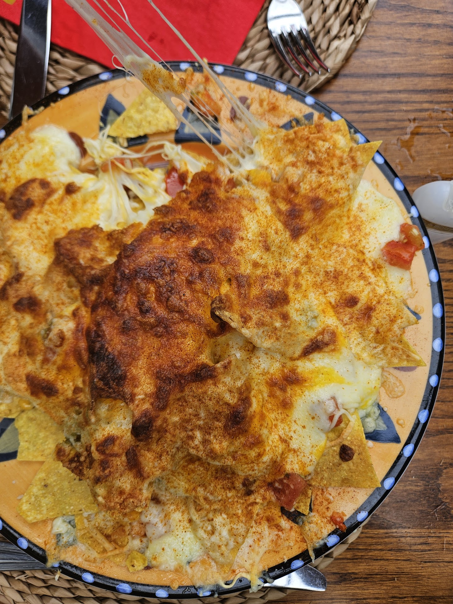 The nachos could use cheese throughout the dish and not just on top. You end up with dry chips. The enchiladas pollo: the Pollo was good. The corn tortilla shell tasted like it had been refrigerated, then heated up, and the sauce did it no justice. It would have been better with sour cream, verde, or cheese. The rice is very heavily tomato-based, as opposed to using the Sázon Goya bouillon to season it. The service of the staff was top notch; however, my glass was dirty. I didn't notice until after I poured my drink into it. I chose not to say anything since I failed to notice the dirt. The atmosphere was nice. I enjoyed the time with my family, without screaming over music.