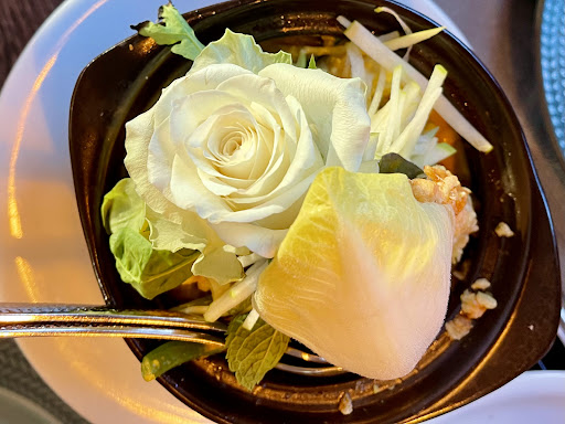 Als das Essen kommt, sind wir vom Anblick begeistert. Sehr schön angerichtet. Etwas kitschig mit Rosen aber das gehört sich hier wohl so.