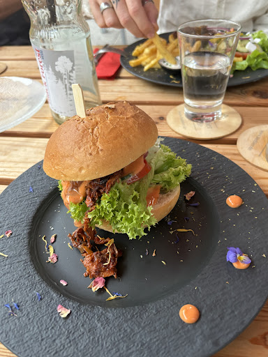 Das Essen an sich ist auch gut gemacht, nett angerichtet. Bei unserem gestrigen Besuch hat es jedoch extrem lange (weit über 1 h) auf sich warten lassen. Die Portionen waren dann auch leider nicht sehr groß, zudem waren bei den Burgern keine Pommes dabei. Darauf hatte uns der Service bei der Bestellung nicht aufmerksam gemacht, wäre ja voll geschäftstüchtig gewesen. Dafür sind die Gerichte herzhaft bepreist, den Jackfruit Burger ohne Pommes zum Beispiel gibt’s für 13, ein kleines Arancini Bällchen für ebenfalls 13, „Gyros“ (das geschmackliche Highlight)-Teller -mit ner Hand voll Pommes in dem Fall- für stolze 18 €.