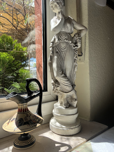 The ambiente... well inside it's the typical greek restaurant, mostly white walls, some statues, some paintings/ornaments. Outside however.. well it's a standard Biergarten. No greek ornaments, statues, paintings or anything of sorts. Plenty of succulents in pots, yet a lot of these were dried up. The Parasols were opened too, even though no sun or rain was present. The hot air got trapped under them and it was kind of stuffy even though we were outside.