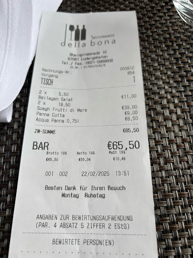 Heute war ich zum ersten Mal in diesem Restaurant. Ich arbeite um die Ecke doch meine Kollegen haben mir bisher abgeraten das Restaurant zu besuchen. Es sei ok, aber das Geld nicht wert. Nachdem ich im Anschluss meines Spaziergangs Hunger bekam, entschloss ich mir einen Salat bei Della Bona zu kaufen und damit dem Restaurant eine Chance zu geben. Der erste Kellner der mich empfing war sehr nett, das muss ich sagen. Ich erkundigte mich zuerst ob ich mit Kreditkarte bezahlen könne. Daraufhin fragte er (vermutlich seinen Chef) ob das geht. Die angesprochene Person sah mich an, machte eine fordernde Bewegung mit den Schultern und fragte mich ob ich keine 6,50€ habe, als ob es meine Pflicht wäre immer Bargeld bei mir zu haben. Darauf erwiderte ich, dass ich kein Bargeld dabei habe. Widerwillig ging er in die Küche. Ich sah, dass sein Kollege frischen Teig zu bereite. Der vermeintliche Chef allerdings holte etwas aus einer Tüte und ich dachte mir nichts dabei. Nach dem ich den Salat gegessen hatte war ich mir sicher, dass es das Brot vom Vortag gewesen sein muss. Deshalb waren der Salat und das Brot auch innerhalb 3 Minuten fertig. Es war warm gemacht, allerdings definitiv nicht frisch. Geschmacklich war es gut aber leider knatschig. Ob die Bauchschmerzen die ich jetzt habe vom Essen kommen weiß ich ehrlich gesagt nicht. Es würde mich sehr wundern bei Salat und Brot.