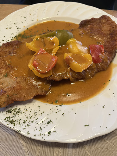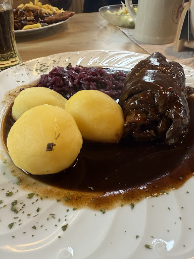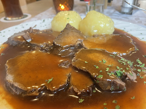 Da hier keine halben Sterne gibt, habe ich 3 Sterne vergeben, hätte aber aber gerne 3,5 Sterne gerne vergeben, bevor ich das Cordon bleu 3 Wochen später gegessen habe- siehe weiter unten… Ich war auf Empfehlung eines Freundes dort. Lokal sehr sauber und gepflegt, freundlich hell, Bedienung sehr freundlich und Aufmerksam. Zum Essen vorab eine Suppe in diesem Fall eine Markklösel suppe, die auch gut war aber jetzt kein besonderer Ausreißer - normale gute Deutsche Küche. Ich habe auch gesehen, was andere Kunden bestellt haben., Was auch optisch sehr gut ausgesehen hat wie zum Beispiel das Cordon bleu das war ein Riesen Trümmer- welches ich auch nächste Woche noch mal probieren möchte und auch rezensieren möchte- Nachtrag kommt. Ich hatte nun Sauerbraten bestellt mit Knödel und hier muss ich leider sagen, es war ein Salat dabei , dieser Salate hatte eine Einheits-Salatsosse was Schade war, da er aus 4 Sorten bestand und leider viel zu Ölig war, er war durchschnittlich. Die Knödel waren gut, die Sauerbraten - Sauce fand ich auch als sehr gut. Hab Fleisch warm ist nur ein bisschen traurig, da von diesen vier guten grösseren Stücken bis auf einen mini Teil das Fleisch nicht ganz super zart war- es war auch nicht sehr fest - zäh auf keinen Fall sondern wenn man es in einer scala zwischen super zart bis fest in 4 stufen einteilen würde ich es Stufe 2,5 Einteilen, es hätte länger eingelegt werden sollen oder eine spur länger gekocht sein sollen . Fazit beim Golden Stern machst Du als Deutsche Küche nichts falsch, es ist zu Empfehlen- ich bin Feinschmecker und Genießer und es war entsprechend meiner Meinung nach meinem Empfinden gut bis besseren durchschnitt zu bewerten ich Schulnoten Note 2,5 jetzt zum Cordon bleu: Es gab einen gemischten Salat als Vorspeise. Leider war auch wieder nicht so optimal, viel zu ölig und Alles schmeckt. Gleich die verschiedenen Salaten. Sutter kommen hier nicht ganz so zum Vorschein, weil Einheit Sauce. Das Cordon bleu ist Mittelmaß und nicht 1 mm besser, wenn man einen Vergleich hat, wie es viel besser gehen kann. Was mir nicht gefällt. Es ist viel zu viel trinken als Füllung in der Mitte das nimmt dem ganzen Fleisch seinen Geschmack weg, der Käse ist geschmacklich 08 15, er ist zwar schön, am verlaufen von der Optik, aber geschmacklich nicht der Rede wert. Das Fleisch könnte ein wenig Faseriger sein was ein Aualitätsmerkmal - deshalb ist das Fleisch, okay aber auch nicht mehr, und leider wird für die Panate eine einfache, überall erhältliche, ganz feine Panade genommen, wenn man dies anders machen würde und es wär ein bisschen grober und ein bisschen ungleichmäßiger würde das schon von der Haptik im Mund viel besser schmecken. Und wer jetzt behauptet, ich würde hier versuchen, etwas schlechte Kritik zu machen, Der kann sich gerne selbst überzeugen und kann meinen ungeschlagenen Cordon bleu Sieger, aus meiner Sicht gerne Kosten - im Anker in Speyer- hätte ich nicht. Diesen Vergleich würde das Cordon bleu bestimmt besser abschneiden. Das hab ich jetzt versucht, zu ehrlich wie möglich wieder zu geben. Ich wünschte mir Besitzer vom Goldenen Stern würde dort hinfahren und würde einfach nur das Cordon bleu mit den Grumbeer Nudeln bestellen, Ohne extra sauce- ich denke, dass er dann am überlegen sein wird - was mich freuen würde. Ich werde mir das Cordon bleu von Goldenen Stern auf Wiedervorlage setzen und es in einem halben Jahr noch...