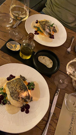 Meine Partnerin und ich gehen seit Jahren in das Schlumachers. Wegen des höheren Preises ist es immer ein besonderer Besuch, der einen bestimmten Grund braucht - das ist vielleicht drei Mal im Jahr der Fall. Wie entscheiden uns immer für das Überraschungsmenü mit 4 Gängen, hier stimmt die Menge und alles andere passt aus unserer Sicht dann preislich nicht mehr. Jeder Besuch endet bei so ungefähr 200 Euro für uns beide, ABER: Nicht jedes Mal zahlen wir diesen Preis mit einem guten Gefühl und einem Lächeln im Gesicht. An einigen Tagen verlassen das Restaurant unfassbar beseelt und schweben zurück Richtung Parkplatz. Noch den ganzen Abend schwärmen wir von der Aromenkombination und der tollen Atmosphäre. An anderen Abenden zahlen wir und sind traurig, weil es nie so lief wie bei den tollen Abenden. Woran liegt das? Das Essen ist jedes Mal handwerklich sehr gut gemacht. Toll präsentiert. Wir lieben die Kombinationen und die Kreativität der Küche. Jede Saison gibt es einen kreativen Cocktail oder Aperitif. Das läutet den Abend gut ein und dann entspannt man in diesem tollen Altbau-Ambiente. Leider ist der Service sehr unterschiedlich und müsste oben eigentlich insgesamt zu "nur" 4,5 Sternen führen. In dem Preissegment möchte ich nur ein Mal darum bitten, dass neues Brot gebracht wird und das nicht häufiger, weil es jedes Mal vergessen wird. Es wäre auch toll, wenn der zum Nachtisch bestellte Cappuccino zeitgleich mit dem Dessert kommt - oder man wird kurz vorher darauf hingewiesen, dass das Dessert nun unmittelbar anrückt und ob man irgendwas dazu trinken möchte. Manchmal wird man bei dem Überraschungsmenü sehr "alleine gelassen", weil einfach nur das Essen gebracht wird und man nichts dazu erklärt bekommt oder man vielleicht gefragt wird, ob man zwischendrin eine kurze Pause einlegen möchte. In der Vinothek ist es schön, aber bei geöffneter Tür wird es echt kalt, ECHT kalt. Es kann einfach nicht sein, dass das Personal die Tür aufreißt, die Tür geöffnet lässt und erst, nachdem alles an alle Gäste verteilt wurde und man am Tisch geschnackt hat, die Tür wieder geschlossen wird. Das passt doch einfach nicht zu dem Anspruch des Restaurants! Und meine letzte Bitte: wenn ich bei all den Besuchen vorher neben meinem Cappuccino ein Stück extra Keks/Kuchen liegen habe, dann gucke ich echt blöd aus der Wäsche, wenn das plötzlich fehlt. Ihr seid wirklich toll, wir kommen unfassbar gerne und haben kein Restaurant öfter besucht als das Schlumachers - aber bitte sorgt dafür, dass diese kleinen Fehler nicht so unbeständig häufig...