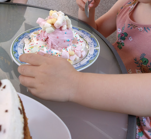 Herlicher Garten, alles beschattet durch Gastronomie Schirme, Eis aus der Theke, selbstgemachte Boule, Kuchen und Torten sowie Kaffeespezialitäten. Das Kaffee war sehr gut besucht, durch das Haus und den gewachsenen Garten ein heimisches Gefühl.