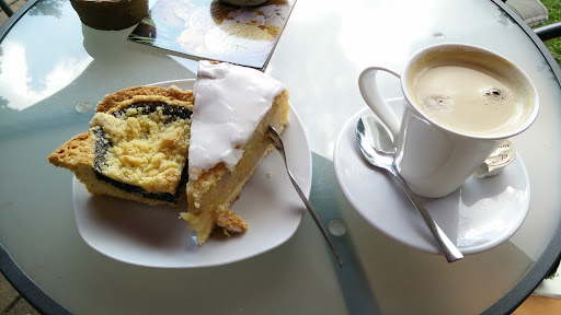 Mohnstreusel mit fluffigem, schön süßem Knetteig, in dem die Eier nicht besonders gut schmecken, gefüllt mit einer sehr schönen Mohnmasse und getoppt mit zu wenigen, weichen Streuseln. "Omas Apfelkuchen" mit weichem Boden (Mürbe- oder Keksteig würden besser passen und einen guten Kontrast zum weichen Kuchen bieten, schätze ich) und gelierter (?), rosinengefüllter Apfelkompottfüllung unter dünner, wieder weicher Decke und einer ordentlichen Schicht Zitronenzuckerguss, die zum wahrscheinlich extra wenig gesüßten Kompott eine gute Ergänzung ist. Der Kaffee schmeckt halbwegs. Wirkt, als wäre die Maschine deutlich besser als der Kaffee, mit dem sie befüllt wird.