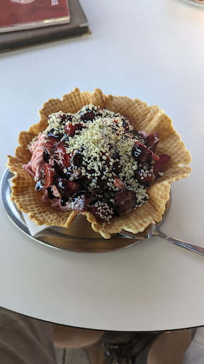 Whilst it was quite busy, we found a free table and were soon being waited on by an efficient and friendly young lady who patiently waited as we tried to compile our order together. Two of us went for the waffles with hot fruit, whipped cream and ice cream. Drinks were coffee and...