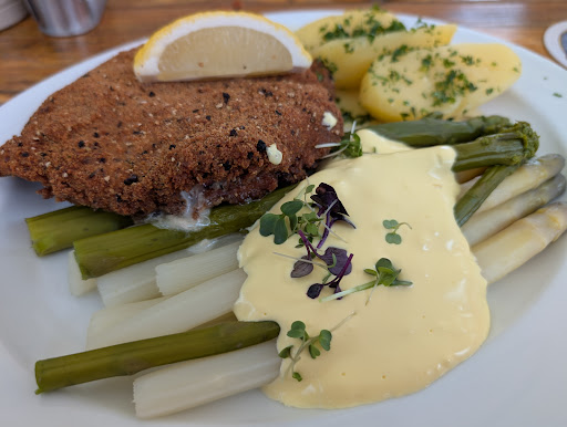 Zur Referenz, hier die ursprüngliche Bewertung: Wir waren heute zum ersten Mal hier und waren durchaus zufrieden. Das Essen ist sehr gut zubereitet und die Zutaten sind hochwertig, vor allem natürlich die hofeigenen Produkt (Spargel, Käse, etc). Die Bedienungen sind sehr freundlich und zuvorkommend, die Karte am Sonntag überschaubar aber gut sortiert. Gesessen haben wir im Außenbereich. Die am Rand stehenden Biergarnituren wirken stimmig und gemütlich. Die in der Mitte aufgestellten Cafetische und Stühle leider nicht so. Das könnte man ansprechender gestalten und bequemere Stühle auswählen. Man sitzt jedoch angenehm schattig unter großen Schirmen und es ist sehr luftig, so dass man nicht ins Schwitzen gerät. Die Bedienung war exzellent, nur wirkte es heute alles etwas hektisch und es wurden 1-2 Bestellungen nicht zu 100% richtig serviert, was wohl an der großen Veranstaltung im Innenbereich lag. Die Freundlichkeit, Schnelligkeit und Flexibilität des Service hat das aber locker wieder weg gemacht. Insgesamt kann ich das Lokal absolut empfehlen, auch wenn es ein zwei kleine Dinge gibt, die optimiert...